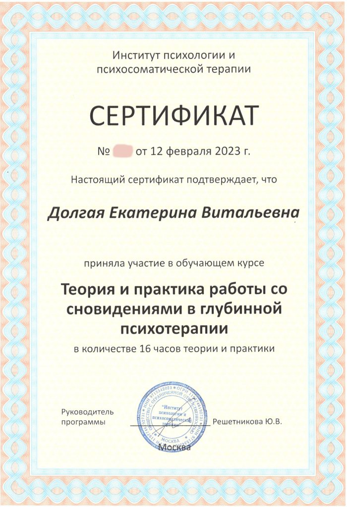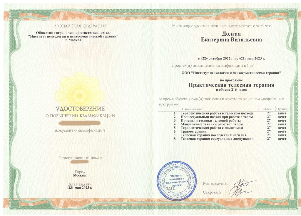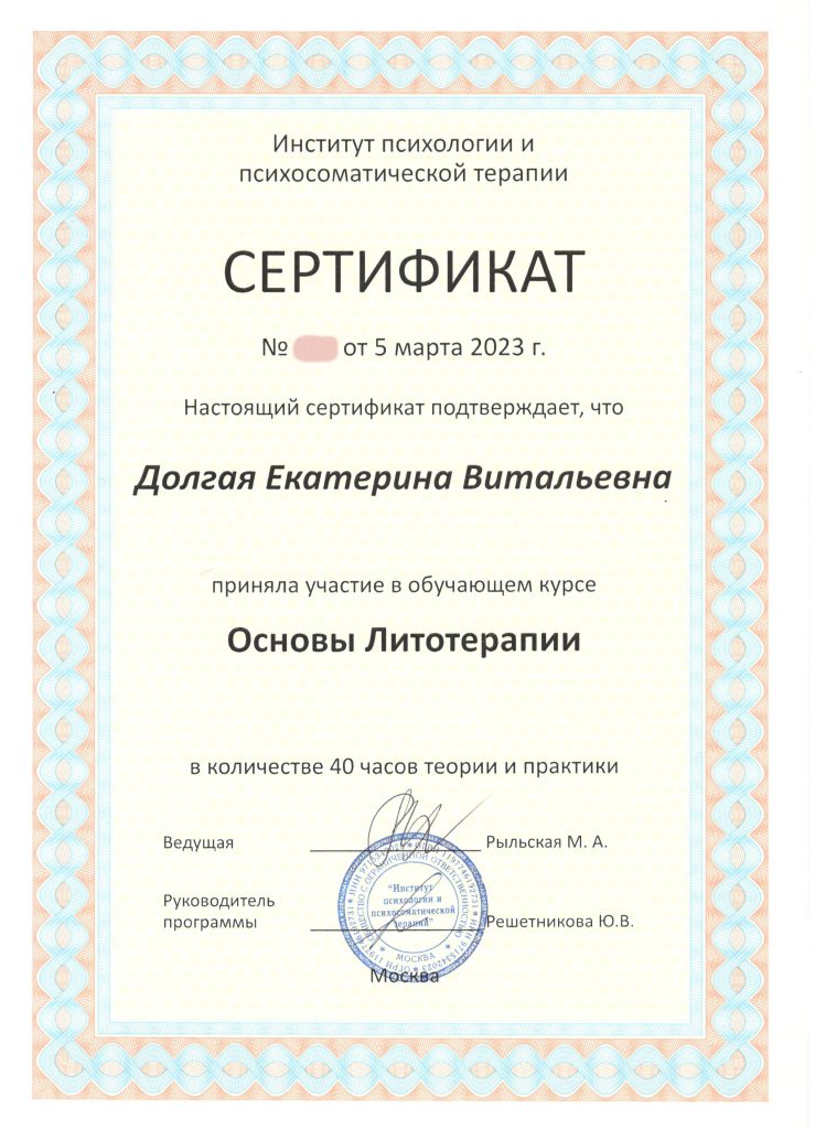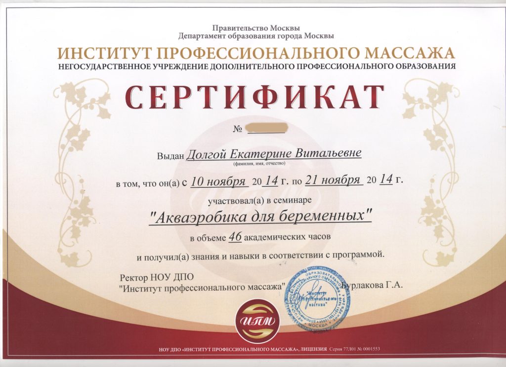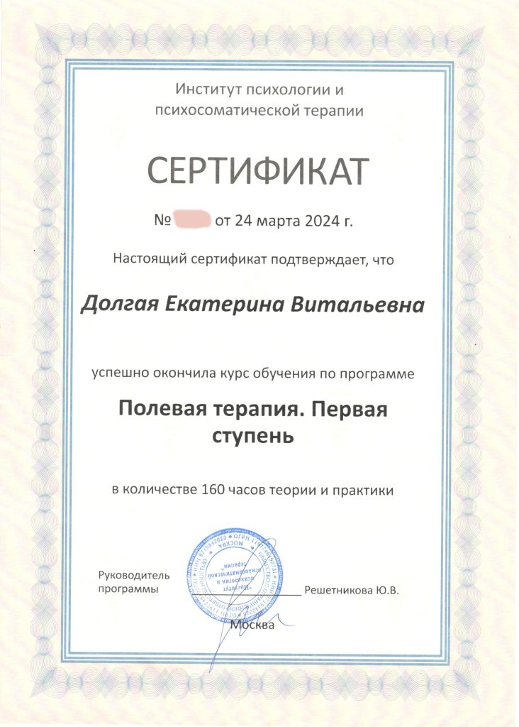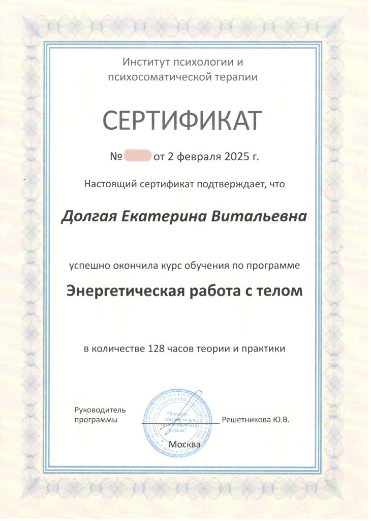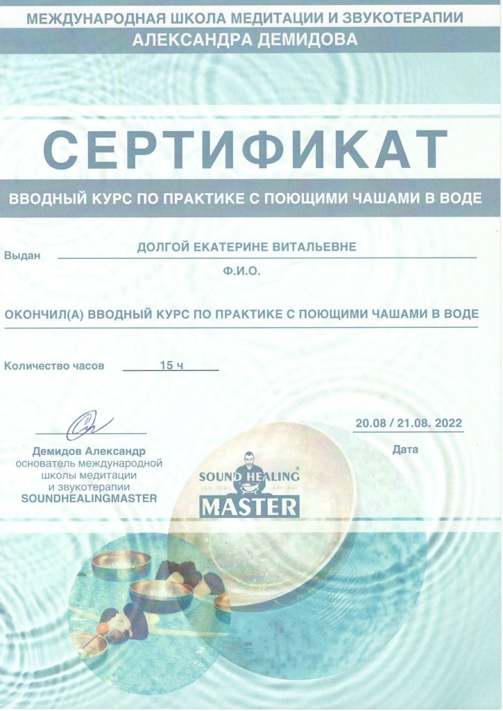 Для улучшения эффекта от Водной терапии, последние три года повышаю квалификацию и практикую в области Психологии — курсы Телесной, Полевой, Энергетической и Психосомато-терапии, работа с Минералами.