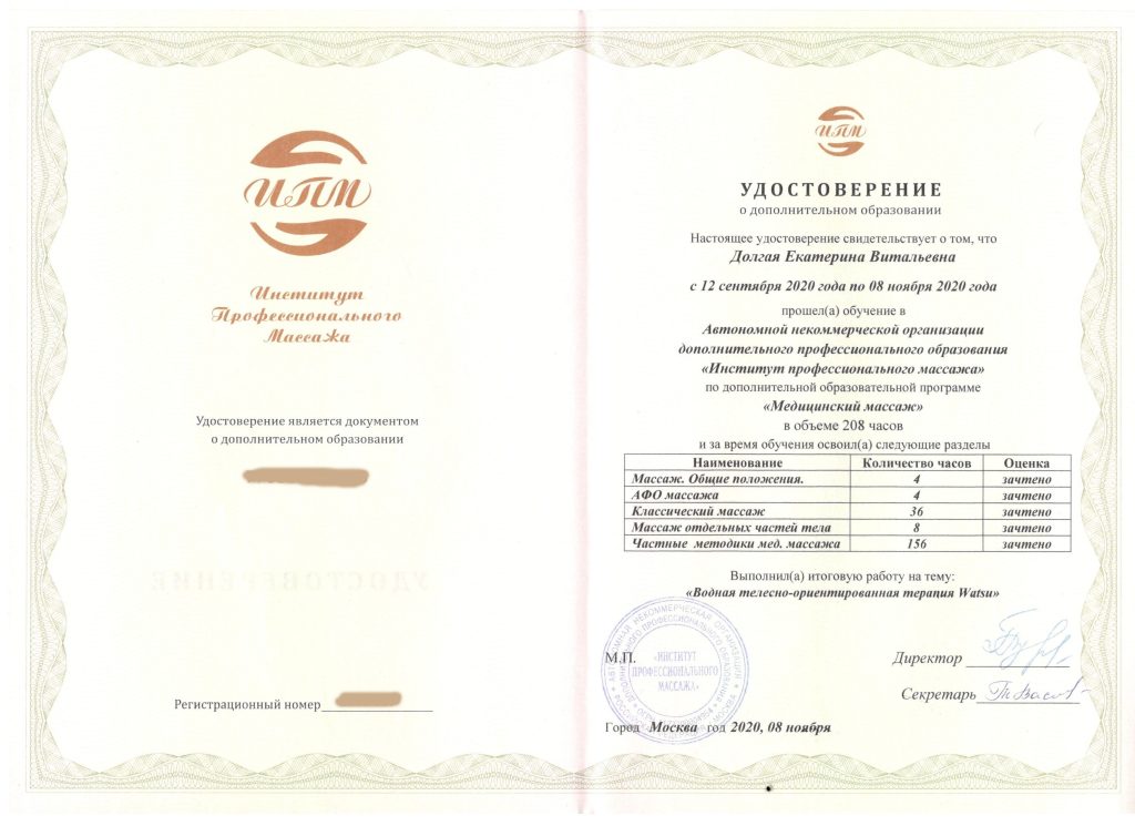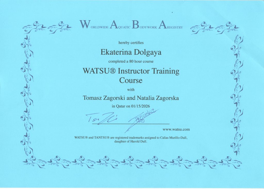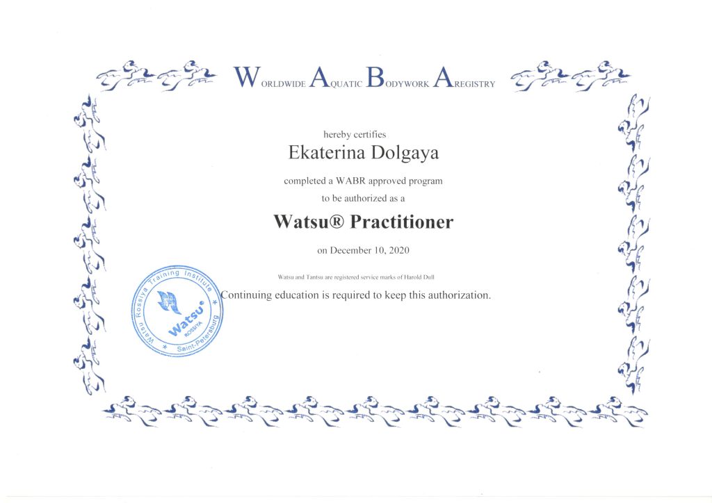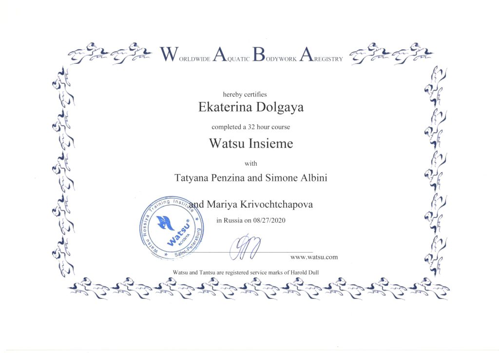 В 2020 году я стала специалистом международного уровня WATSU® PRACTITIONER.